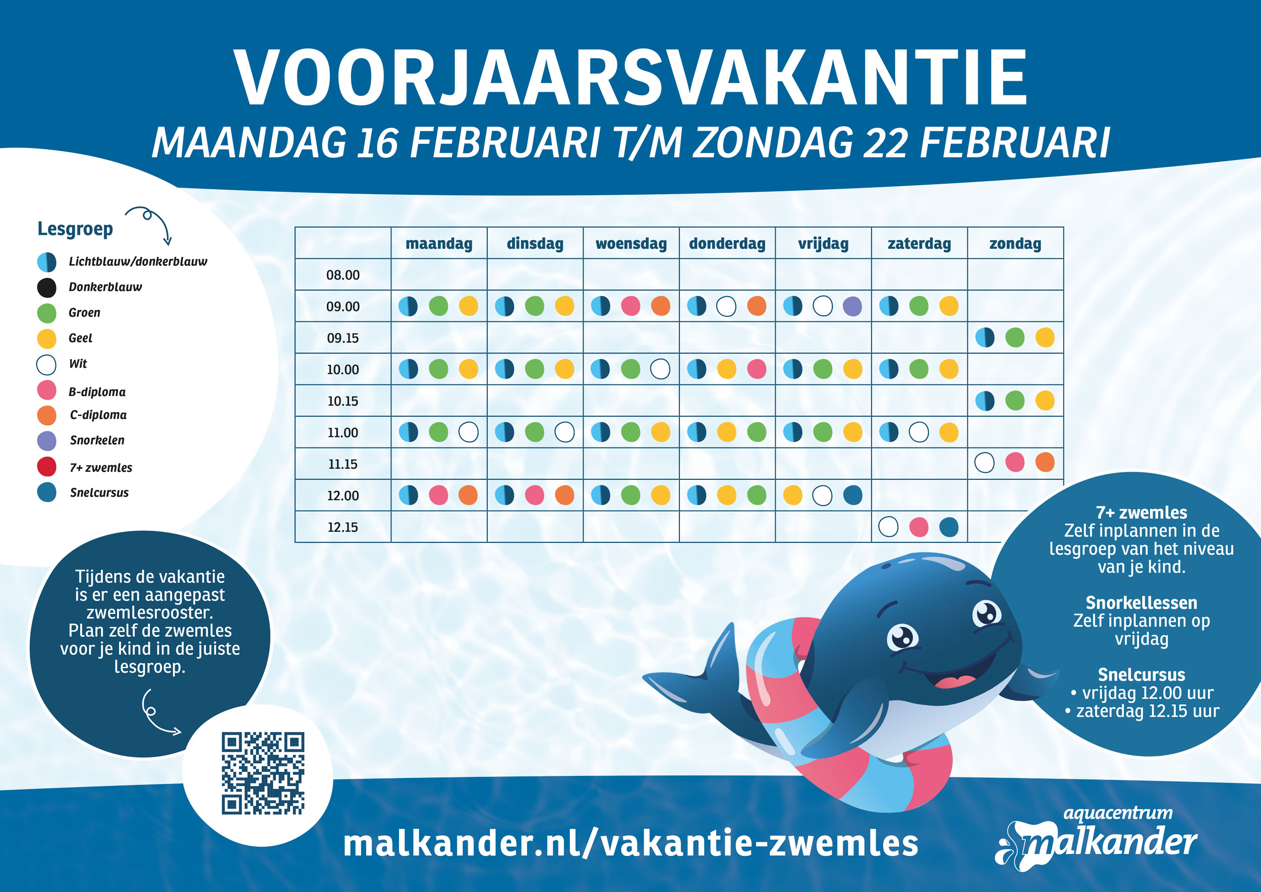 Tijdens de voorjaarsvakantie hanteren we een aangepast zwemlesrooster. Je kunt zelf een lesmoment kiezen voor jouw kind in de lesgroep waarin hij/zij nu zwemt.